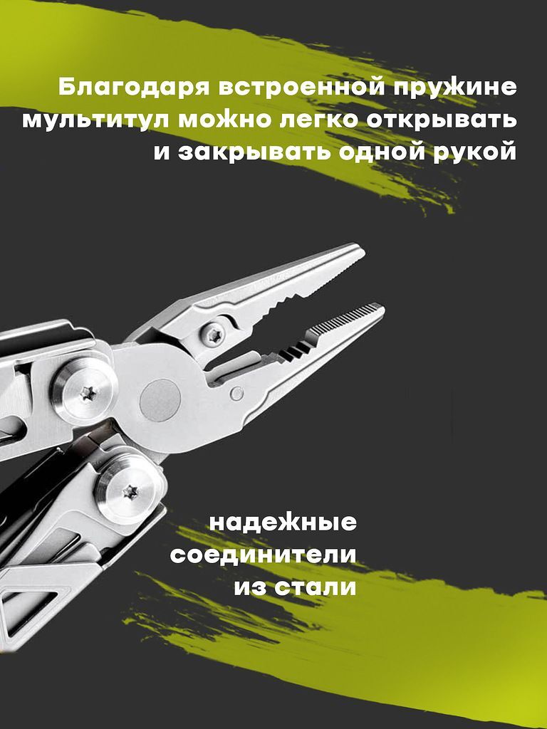 Самоблокирующаяся конструкция: самоблокирующаяся конструкция применима ко всем инструментам. Каждый аксессуар будет заблокирован в полностью открытом состоянии и не сложится, если одновременно не нажать на передний и задний предохранители. Такая конструкция предохраняет многофункциональный инструмент от случайного закрытия и может лучше защитить ваши руки.